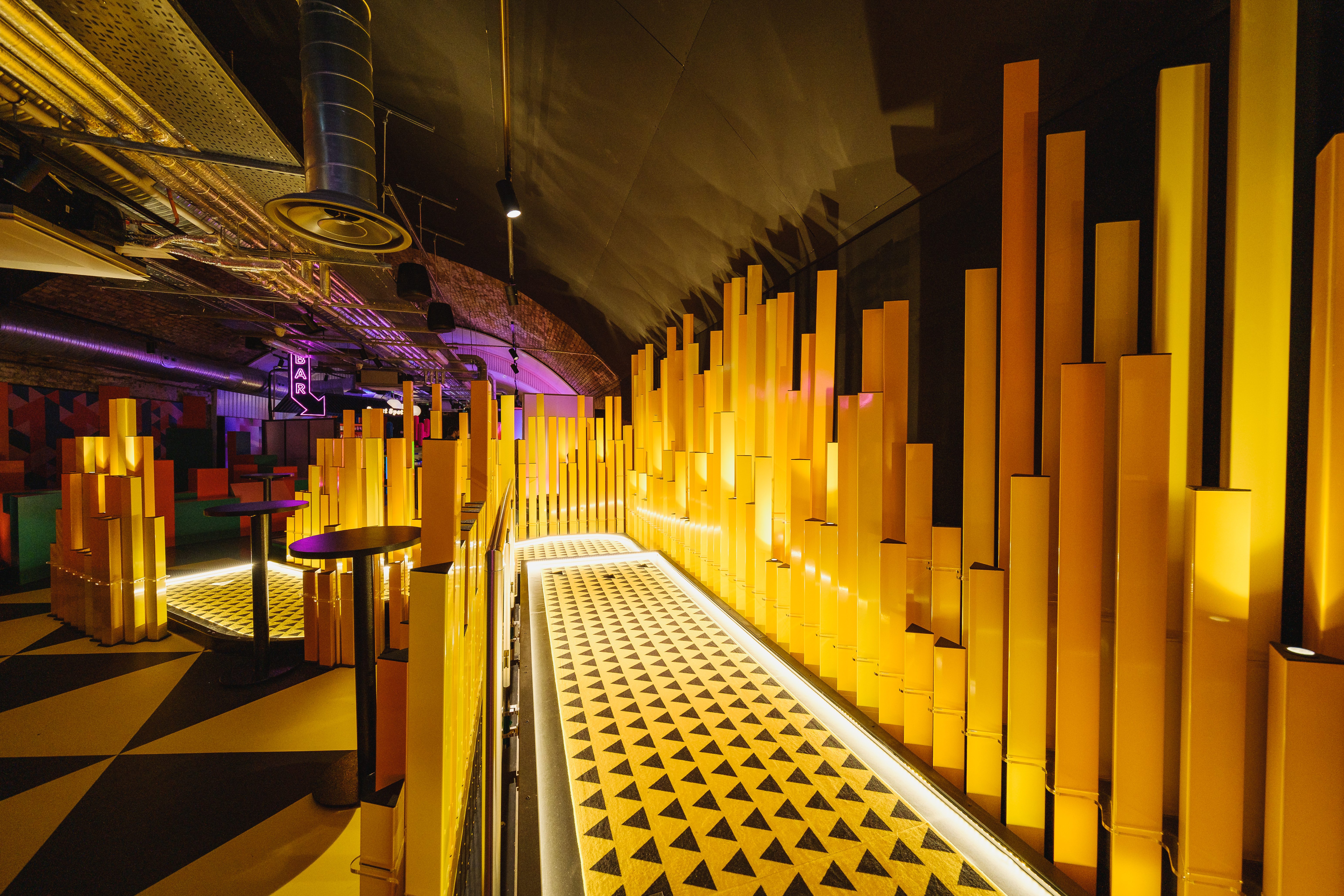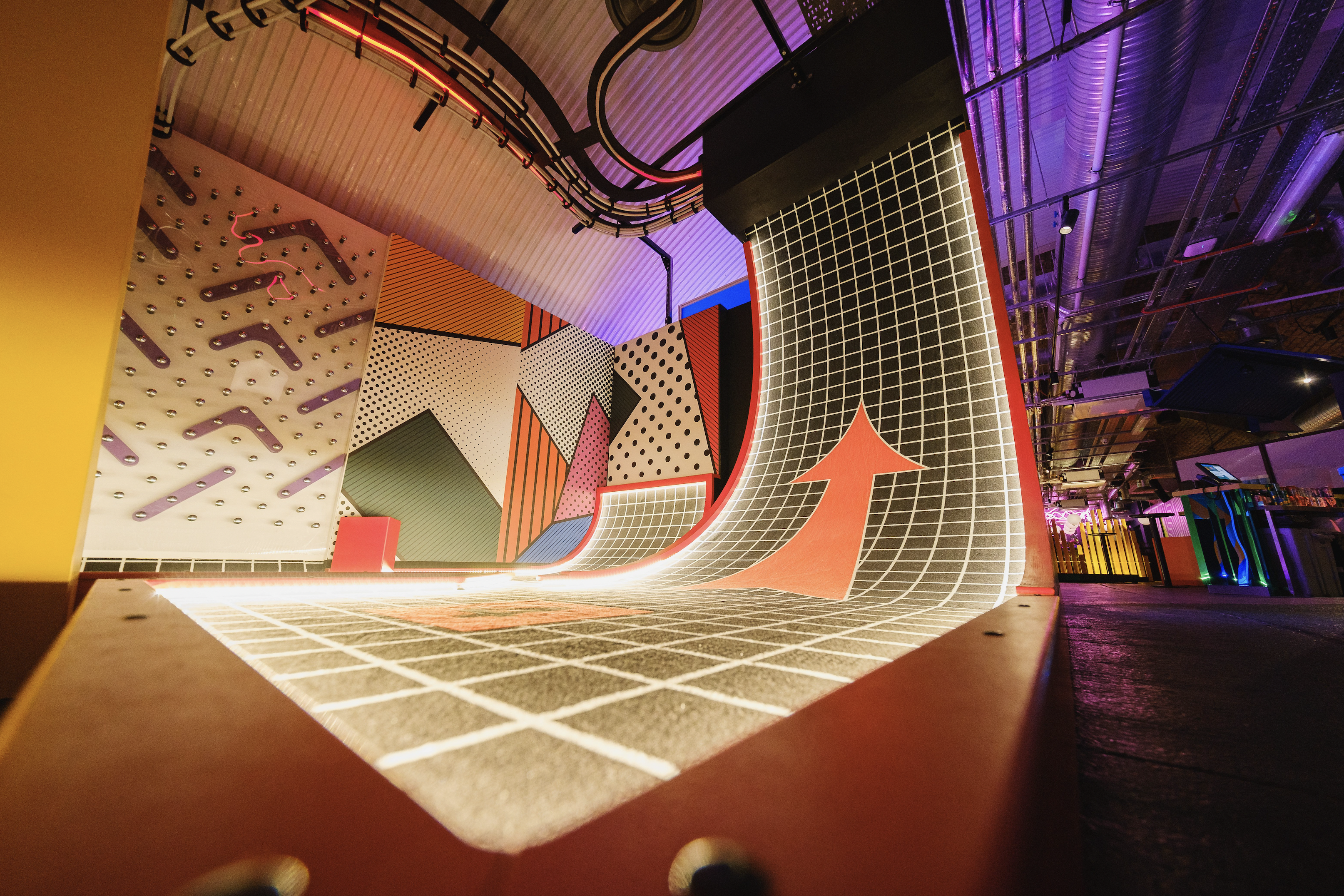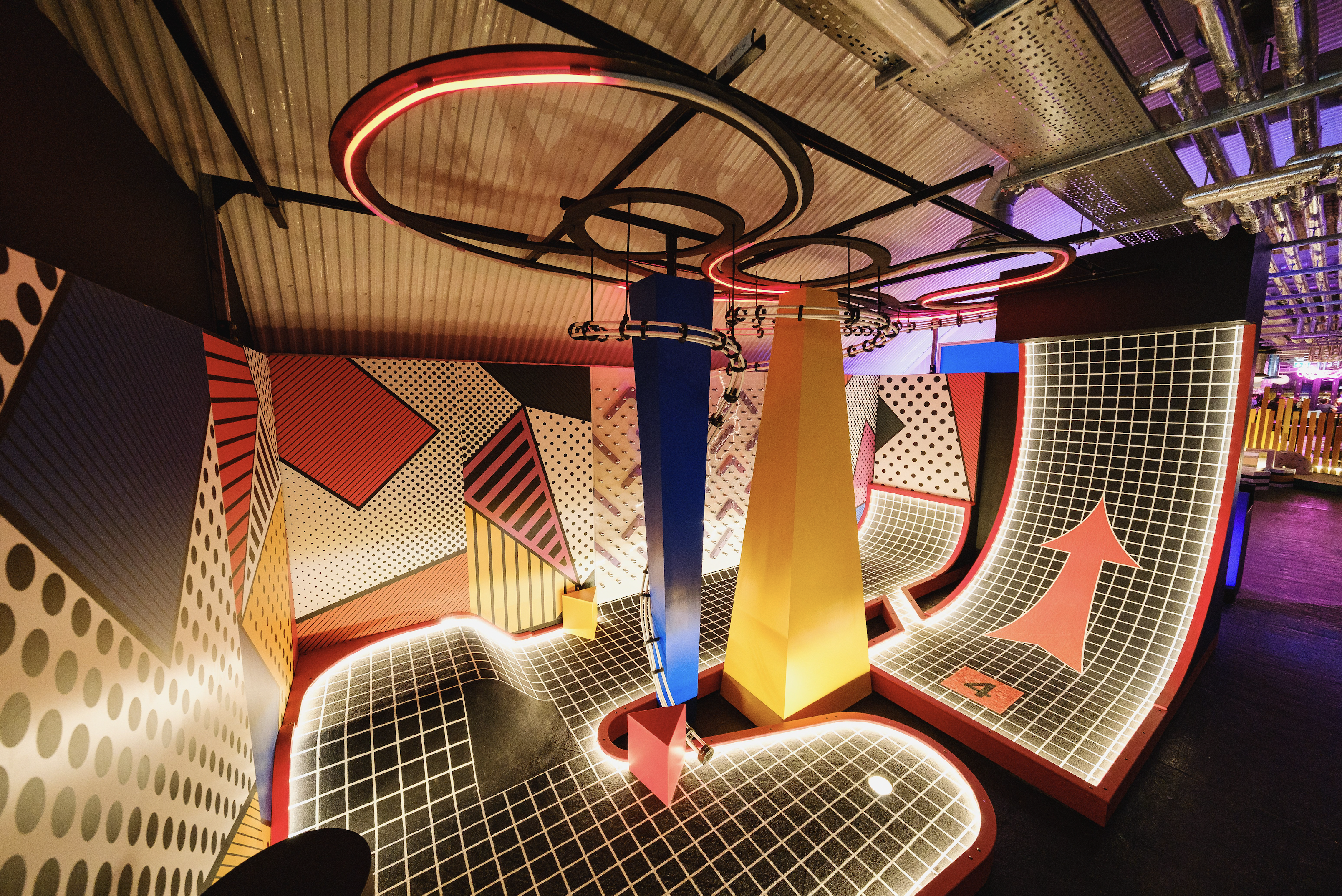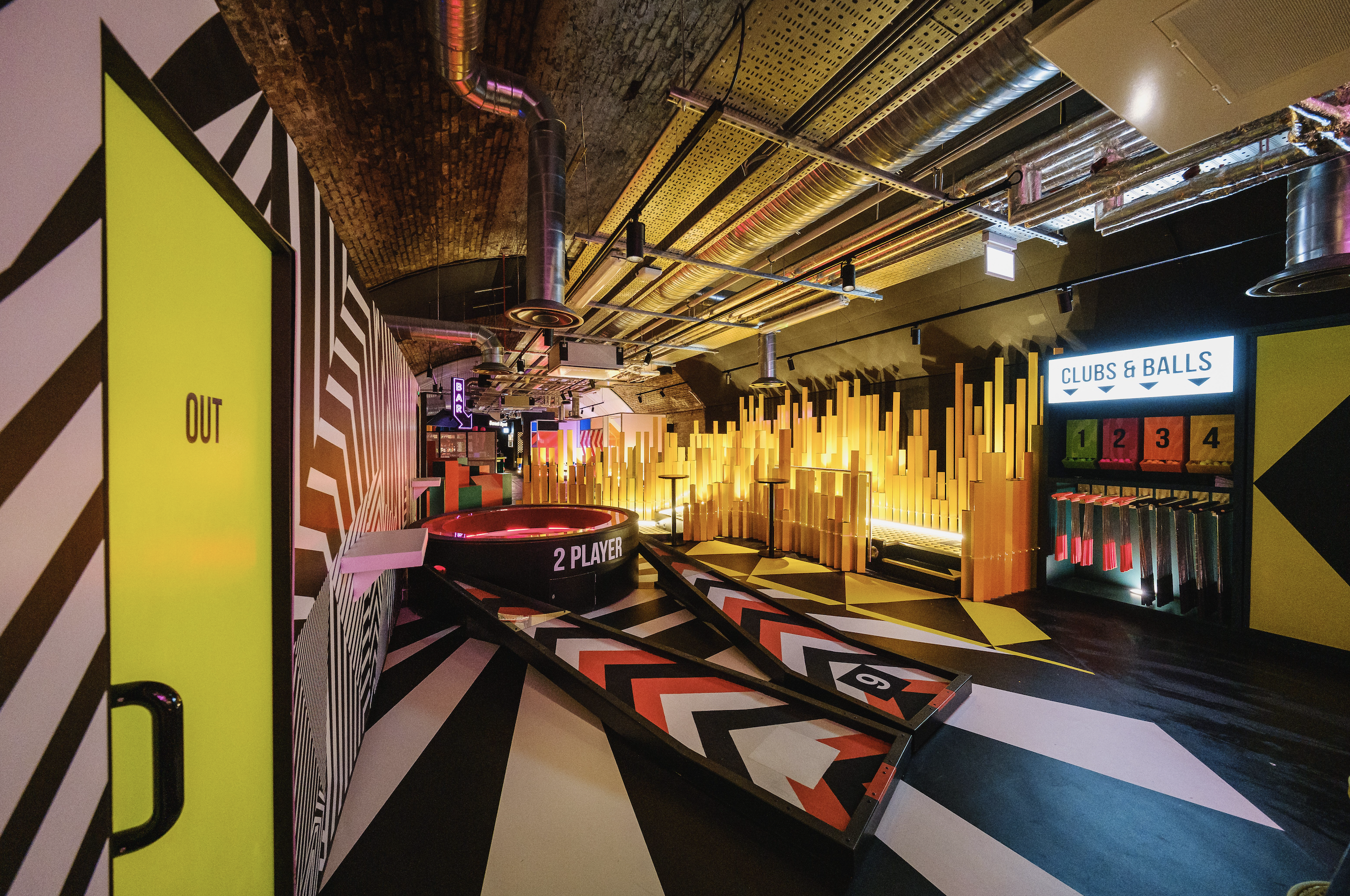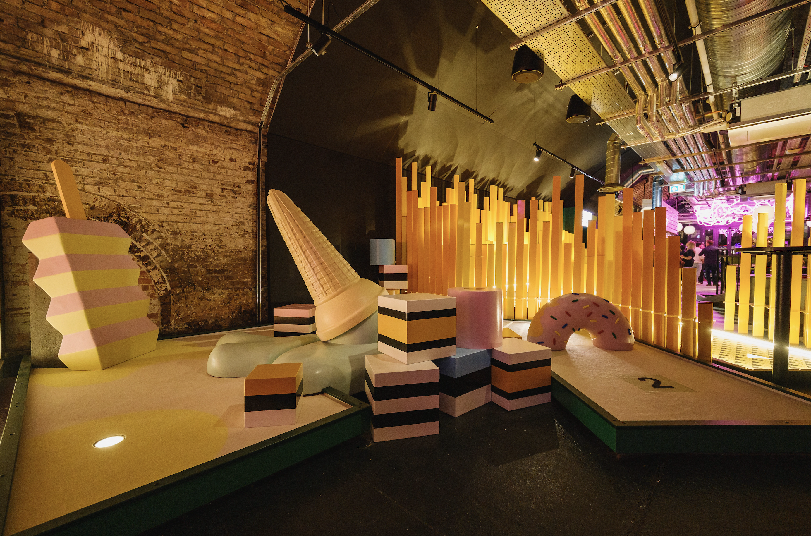 Birdies Crazy Golf, situated inside of an empty London train tunnel is an immersive 9 hole crazy golf course and cocktail bar. Collaborating with award winning interior design studio Shed to design and build a surreal and abstract environment. Inspired by 80’s videos games, patterns and plenty of colors allowed for 9 individually themed holes. The goal was to create a kaleidoscope of experiences to transport the guests into a different world. Holes were designed to be fun, competitive and nothing alike.
