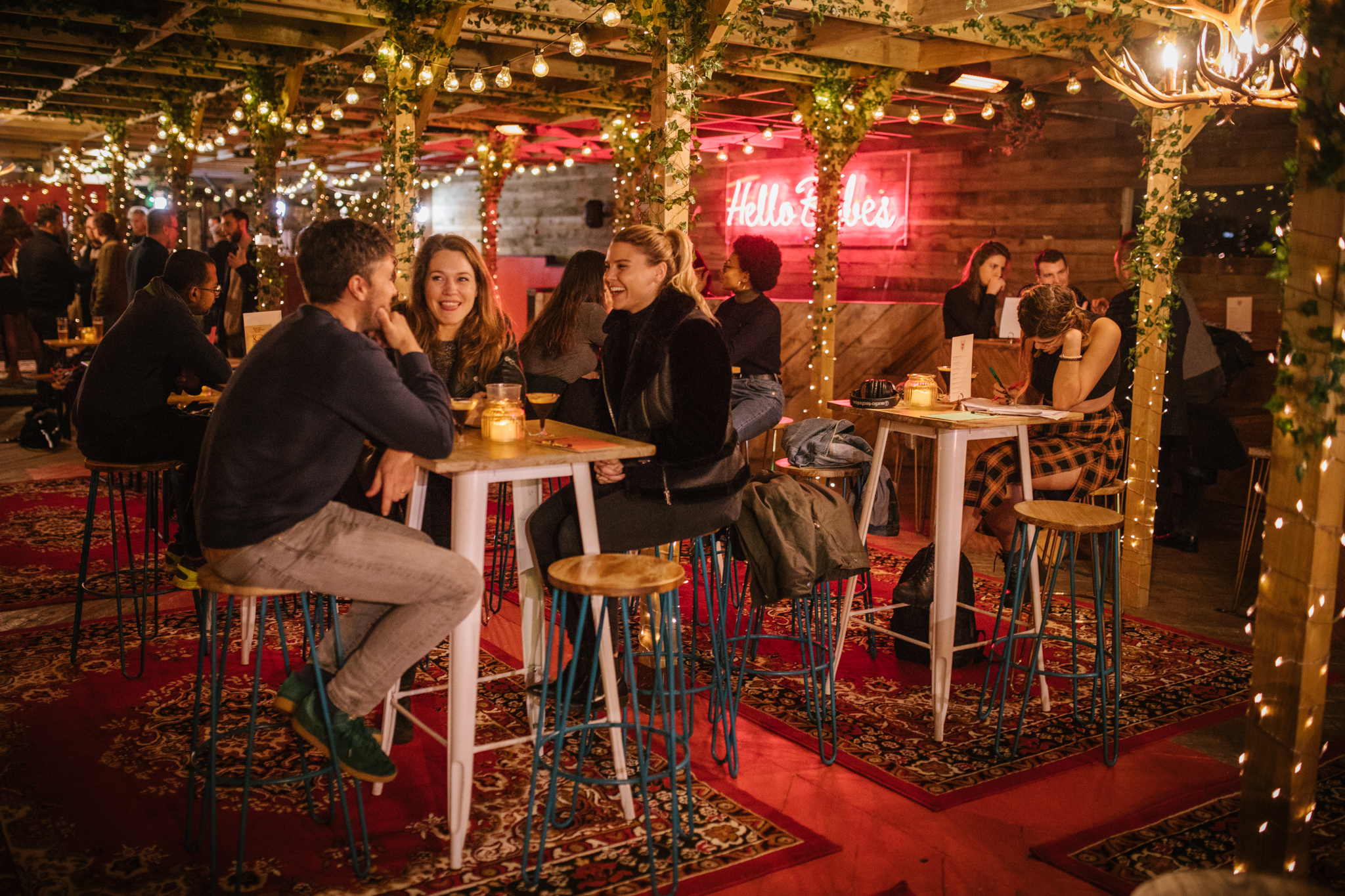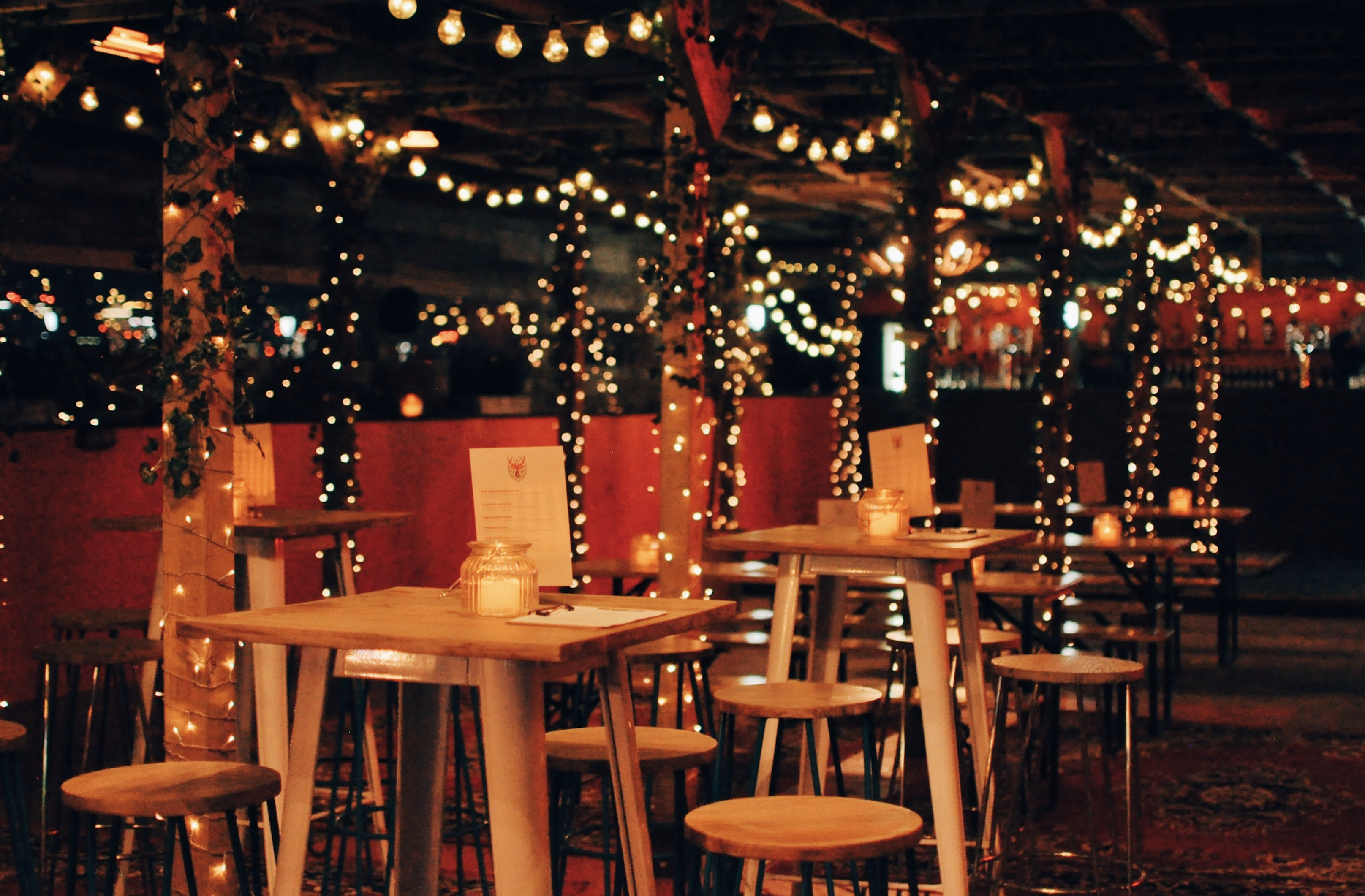 This season captures a cozy winter hub, inspiration was centered around a winter lodge design, rich red furnishing with warm lighting, vines and the introduction of a wooden pergola.