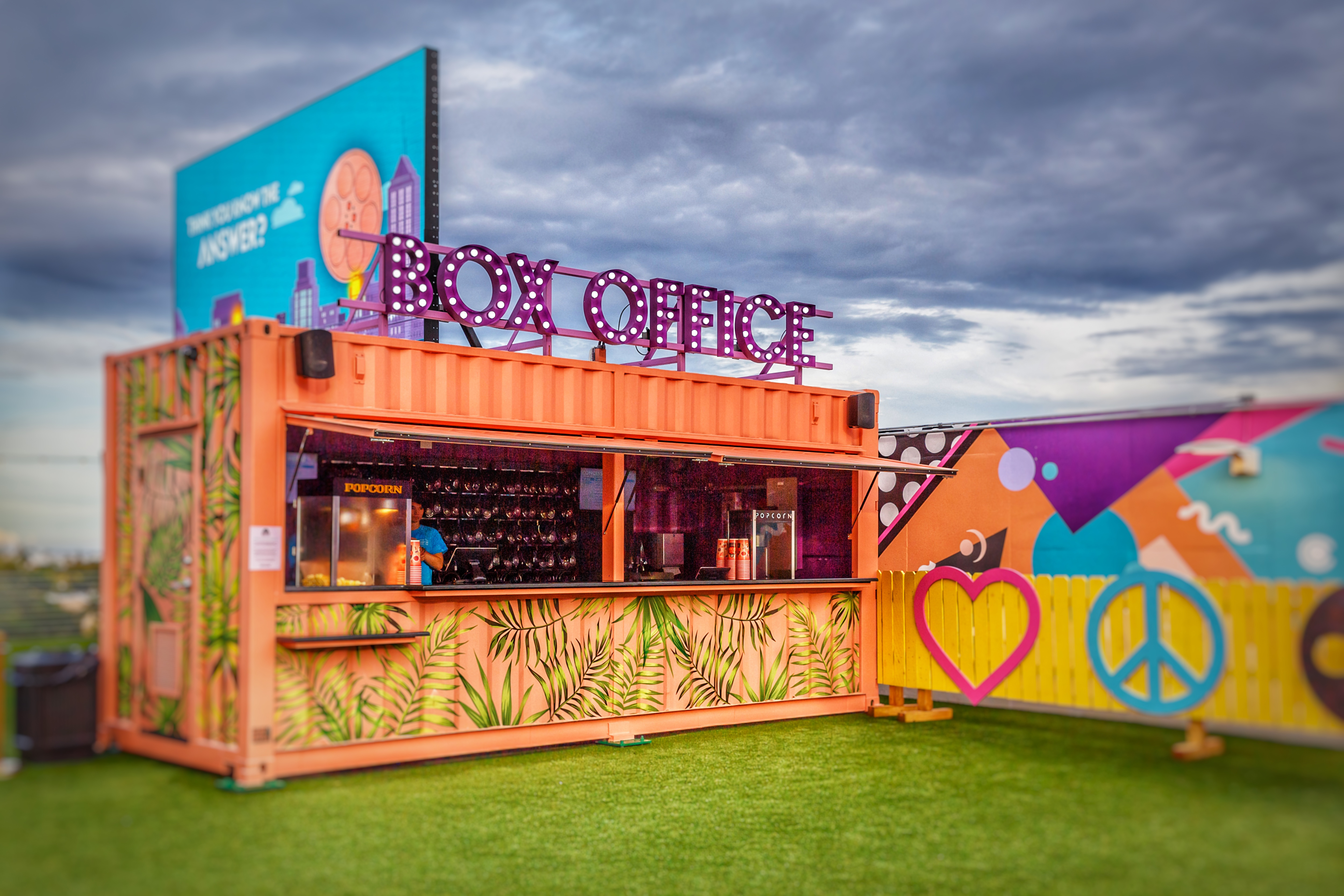 The brief was to transform the top level of a grey urban parking lot into a movie theatre space. A design that is modest in its approach, but unique and welcoming to all guests looking to watch a movie under the stars. We decided to use an abundance of color and print across all surfaces and structures to ensure that we created a definitive line between the movie theater and remaining parking lot. As soon as guests enter, we wanted them to feel removed from the overarching landscape and into a creative installation.