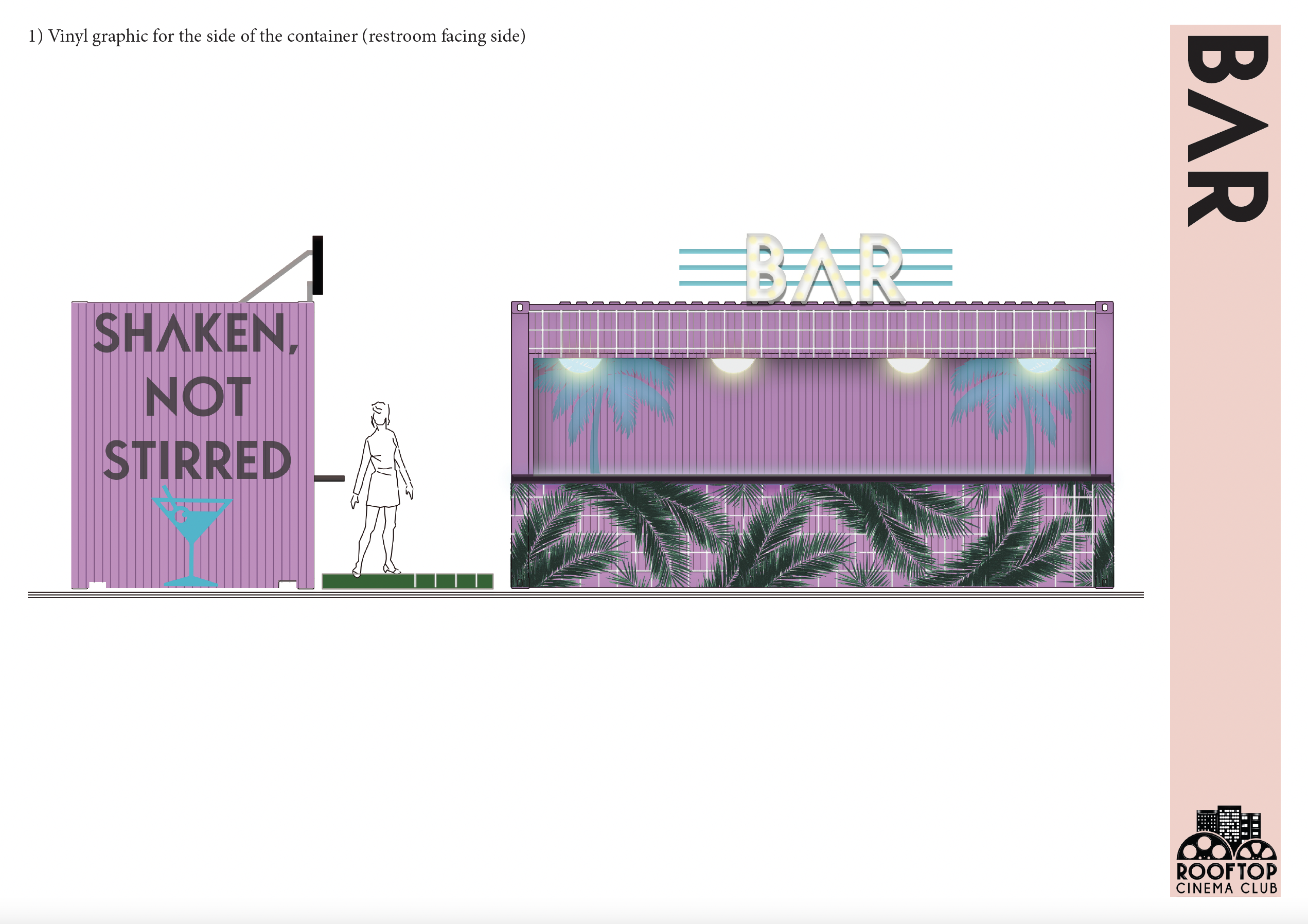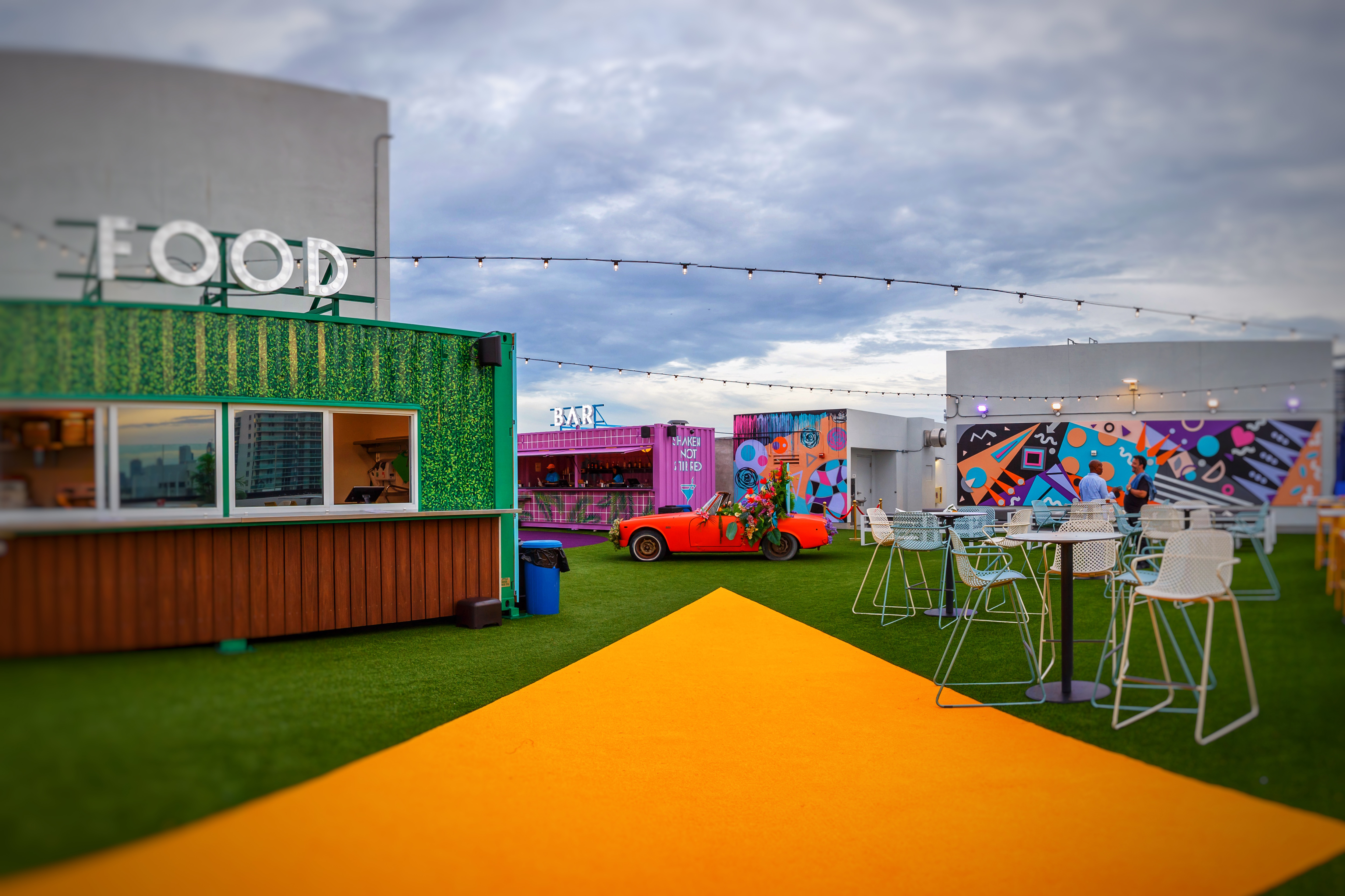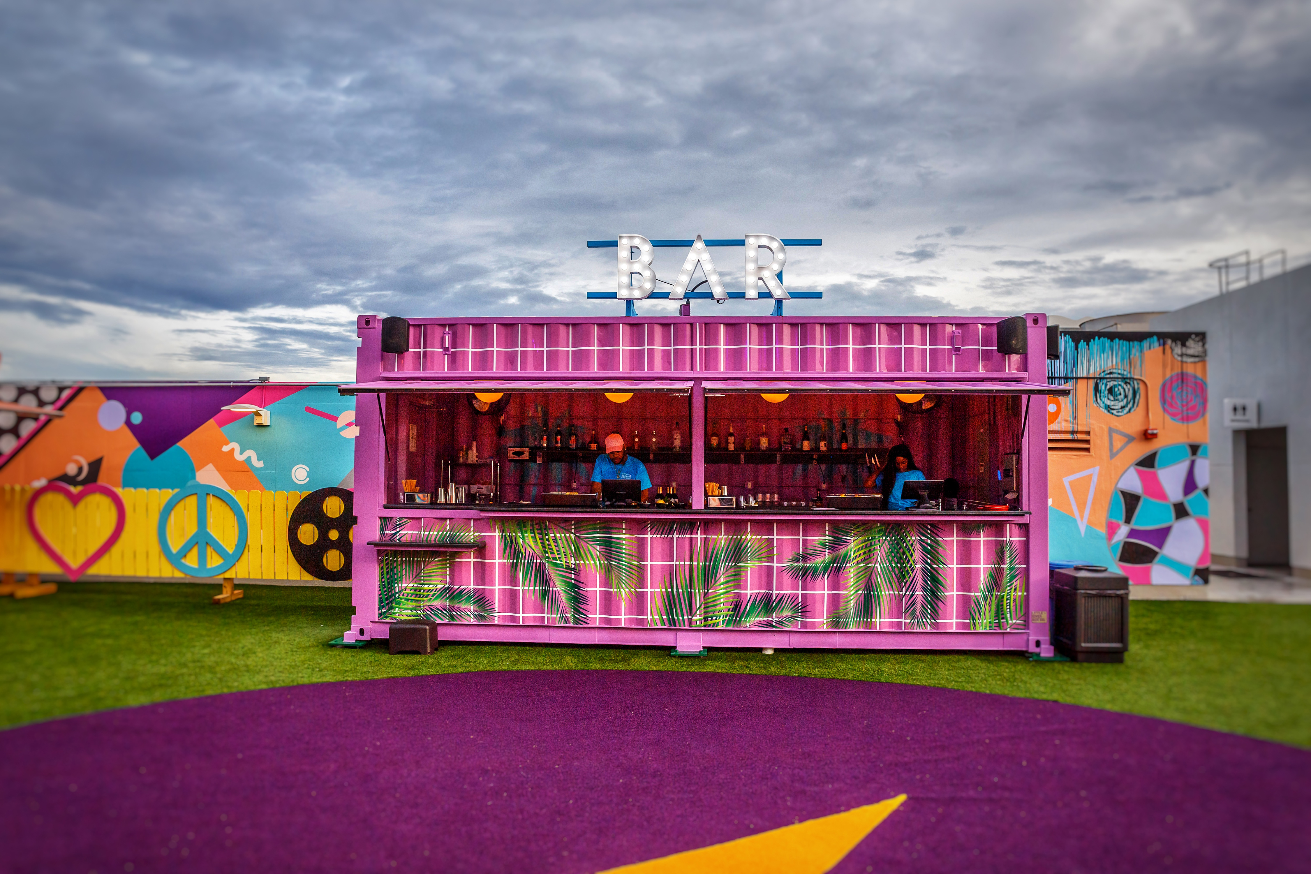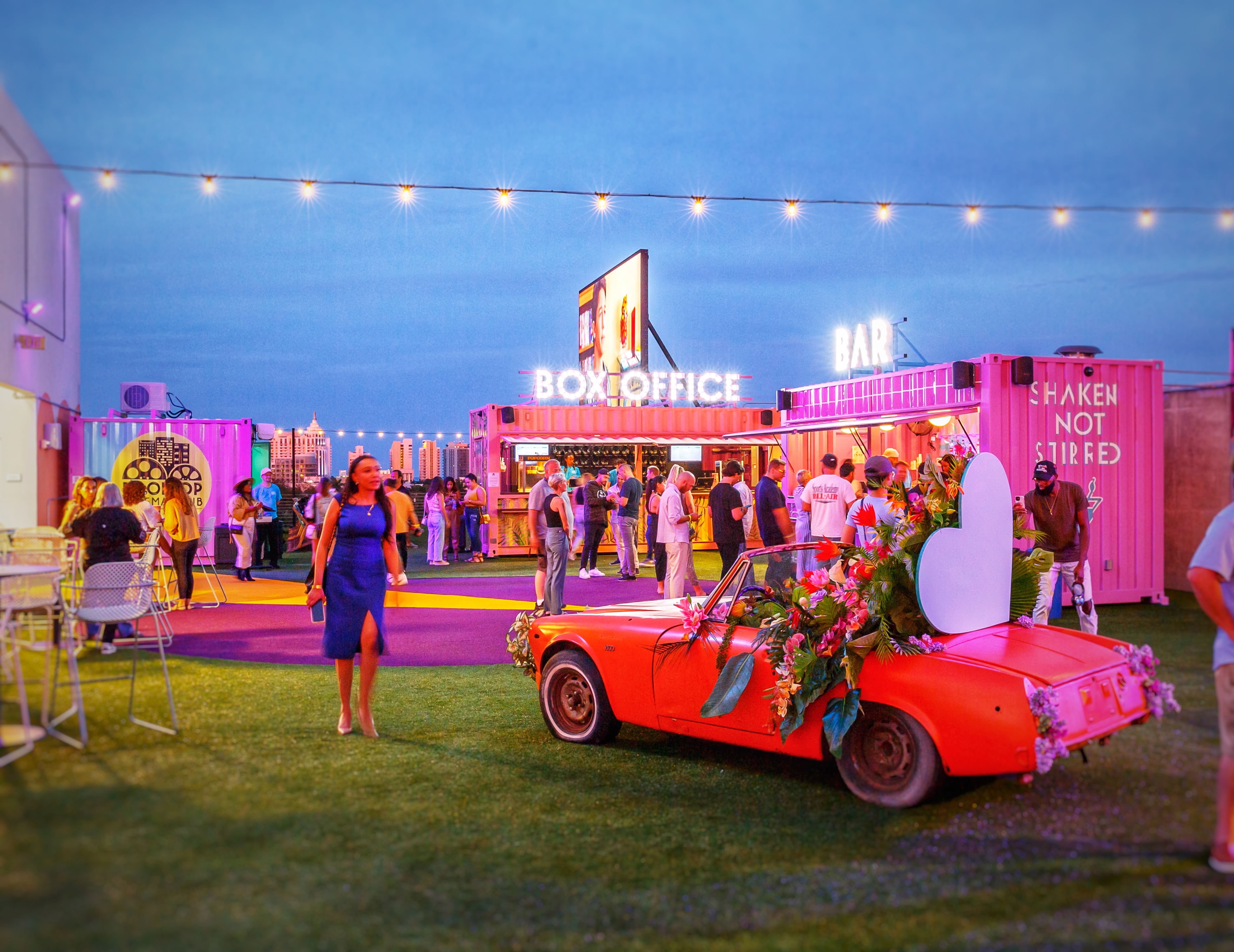 Being that it is an outdoor rooftop space in Miami, the most difficult design challenge was engineering a space that could withstand 170mph winds. A design that is robust but keep its vibrancy and that won’t tarnish in the rain. We modified shipping containers to house the concessions services, but this also allowed us to add additional print and branding to the space. Containers were originally designed to capture the details seen in the interiors of Art Deco inspired movie theaters, large, curved roof with 1920’s style brass detailing and lights, however due to the value engineering to keep the structures in place, we settle on print.