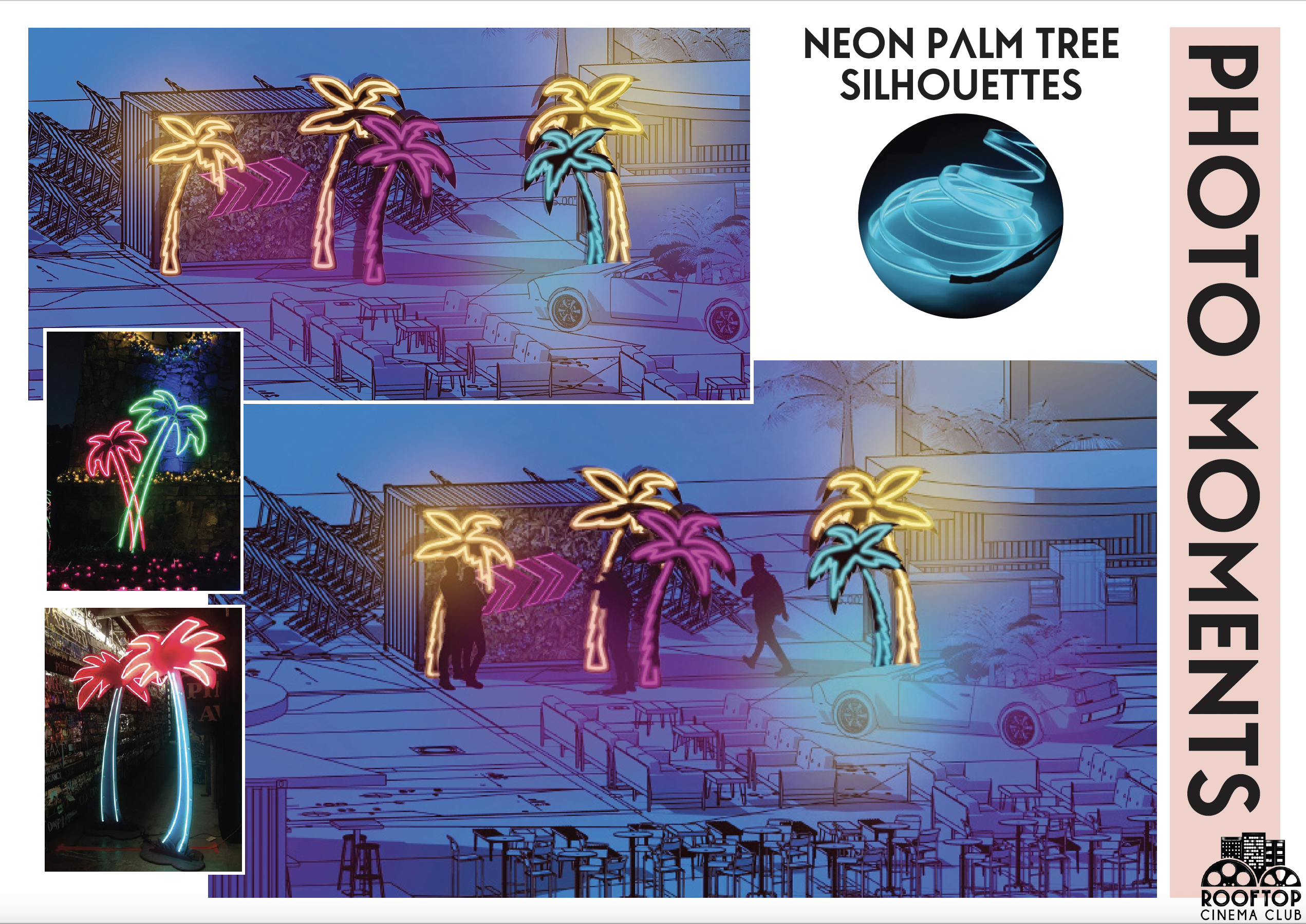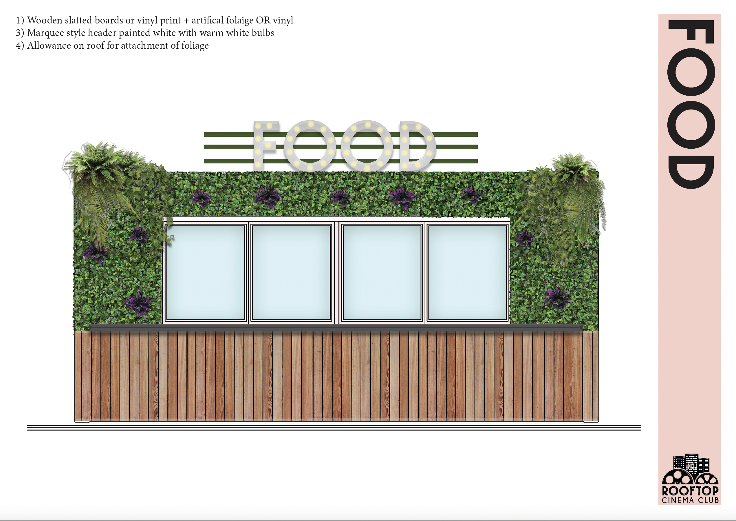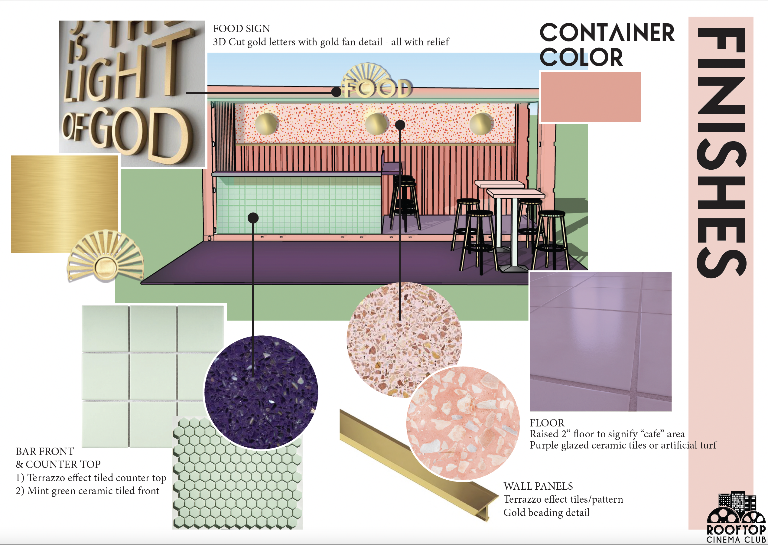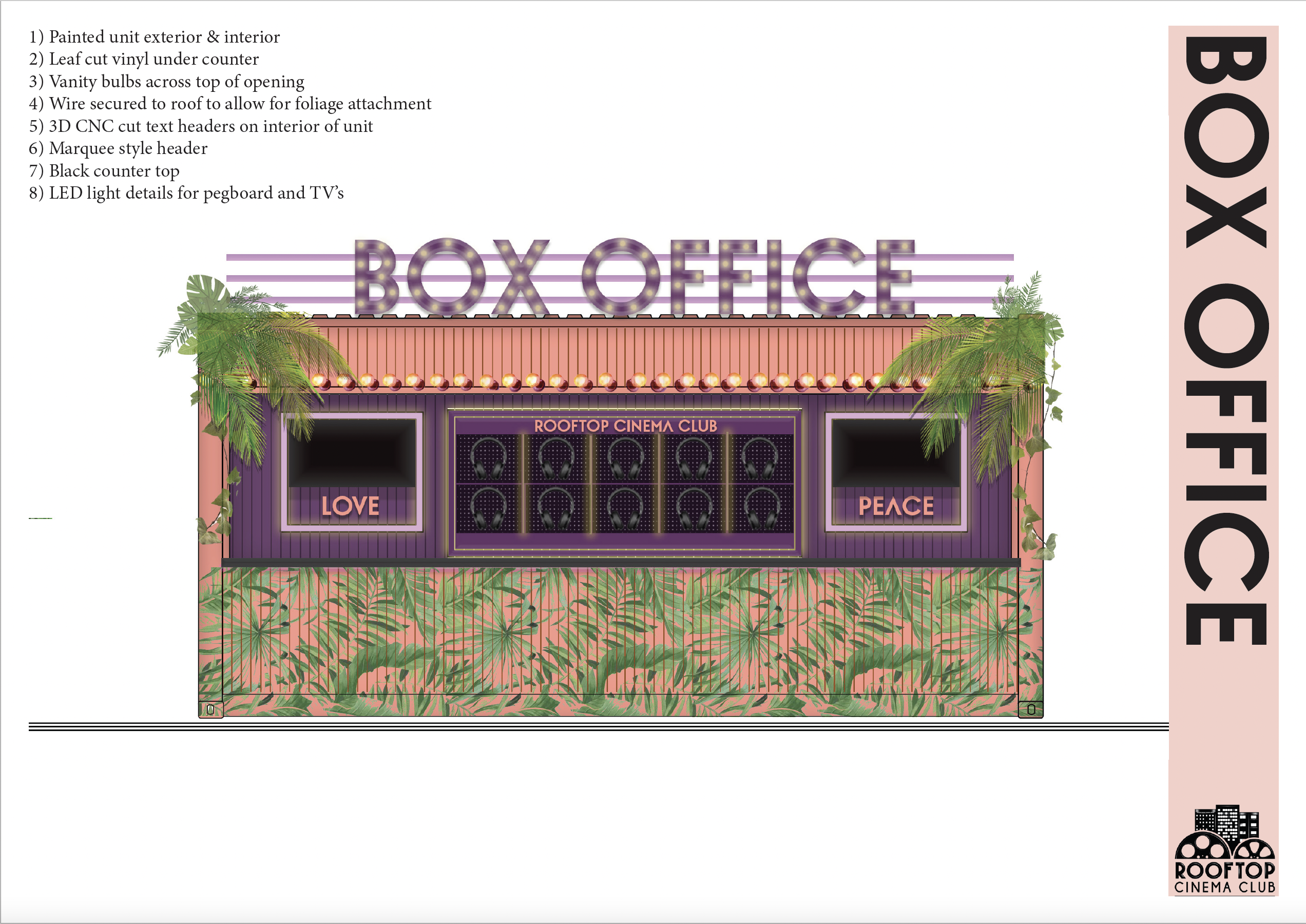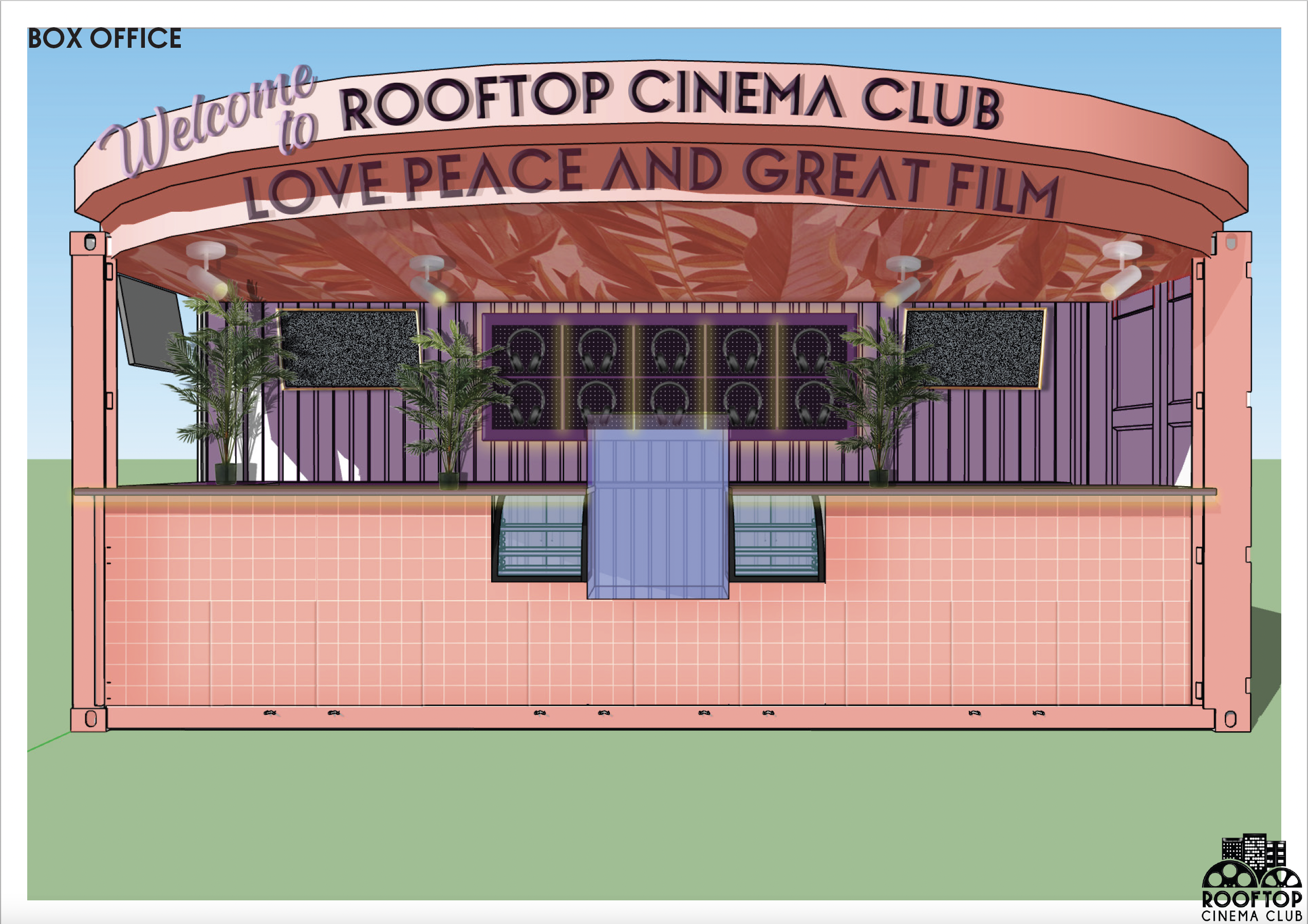 Being that it is an outdoor rooftop space in Miami, the most difficult design challenge was engineering a space that could withstand 170mph winds. A design that is robust but keep its vibrancy and that won’t tarnish in the rain. We modified shipping containers to house the concessions services, but this also allowed us to add additional print and branding to the space. Containers were originally designed to capture the details seen in the interiors of Art Deco inspired movie theaters, large, curved roof with 1920’s style brass detailing and lights, however due to the value engineering to keep the structures in place, we settle on print.